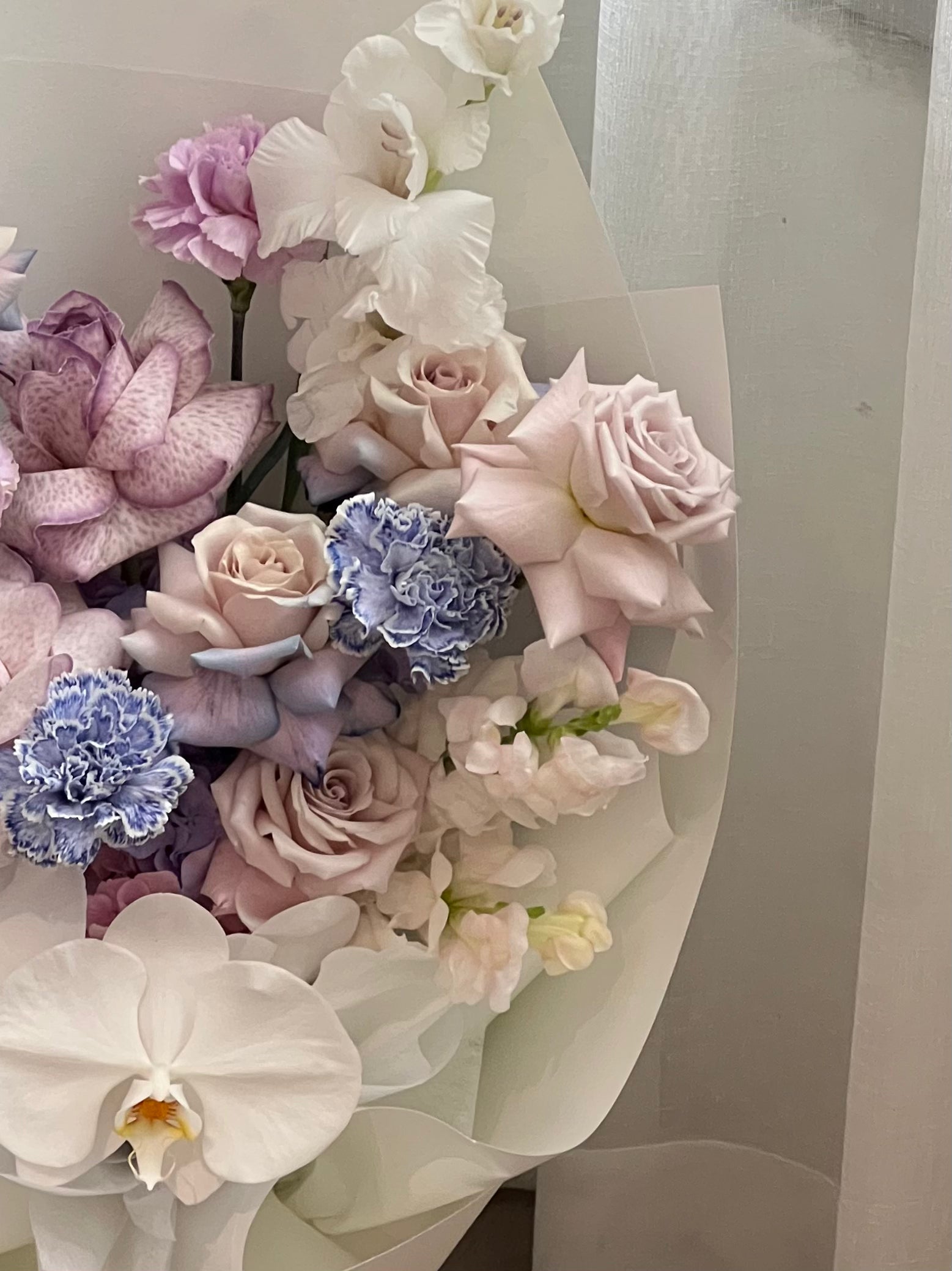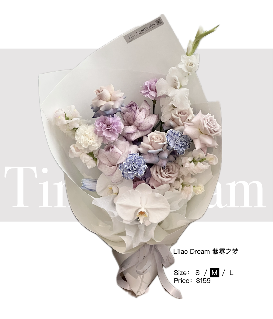 Soft lilac tones unfold gently among sculptural white orchids, creating a bouquet that feels calm, refined, and quietly expressive. The delicate balance between muted lavender, pale blush roses, and airy textures evokes a sense of softness without losing its elegance.