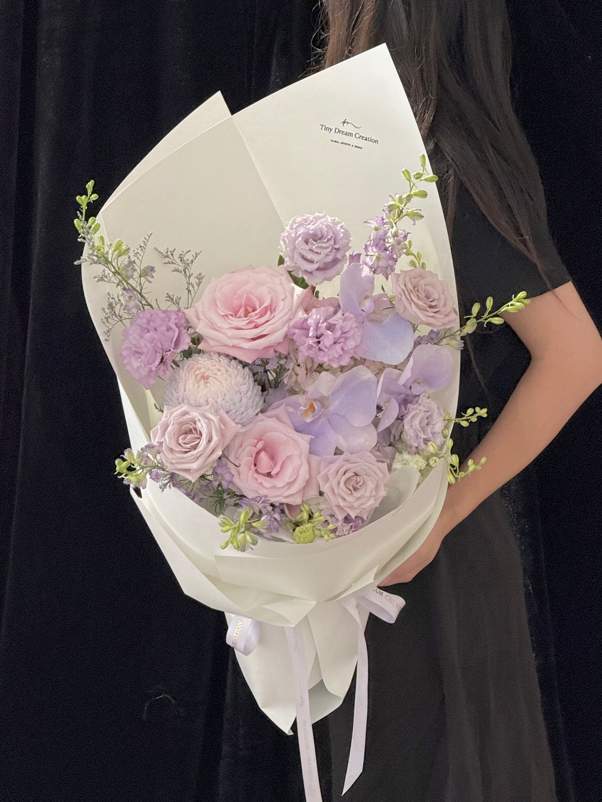 Twilight Whisper captures the serenity of dusk, when everything softens into a calm glow. Elegant yet dreamy, this bouquet speaks the language of quiet affection and timeless grace. Perfect for someone who loves beauty in its most delicate form.
